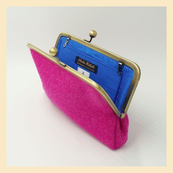 blue evening bag fuchsia Harris Tweed pink and blue clutch bag