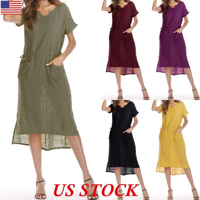 Linen Cotton V Neck Short Sleeve plus size linen dresses usa