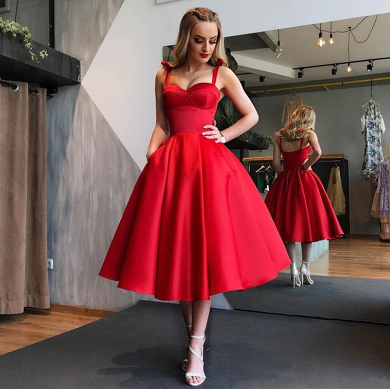 Red Tea Length A Line Prom Dresses retro formal dresses